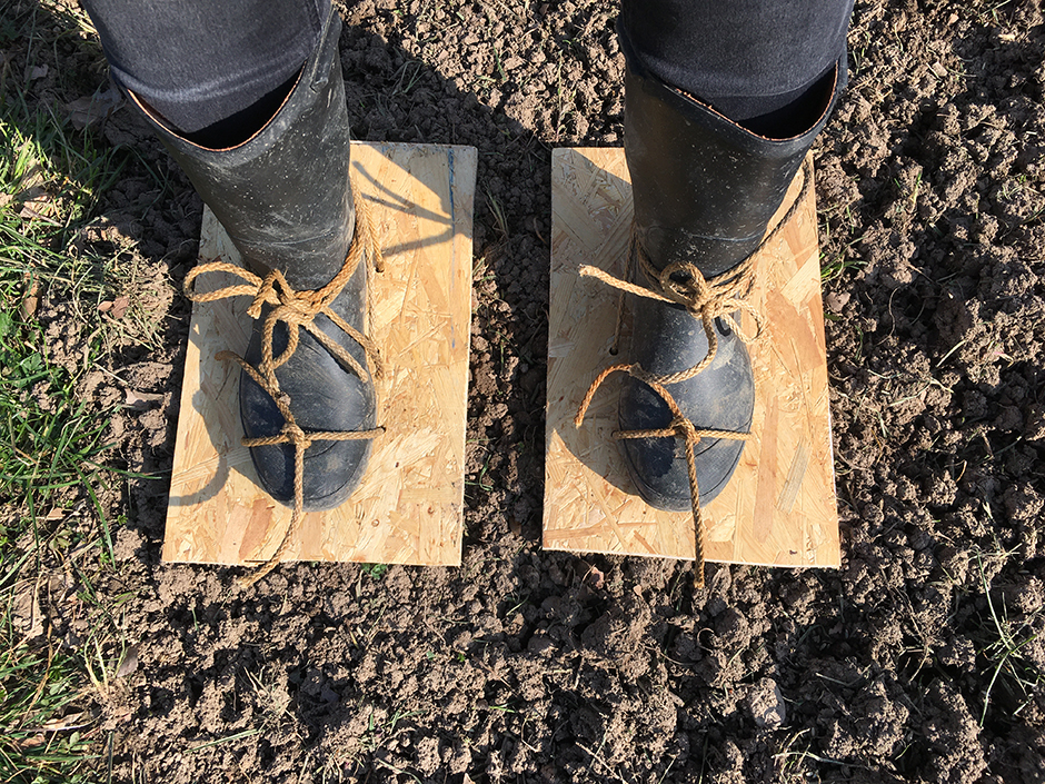 Verdichten der befüllten Erde mittels Eigenkonstruktion ‚Holzplatten-Schuhe‘ und anschließend großzügiges Wässern der Aussaat.
